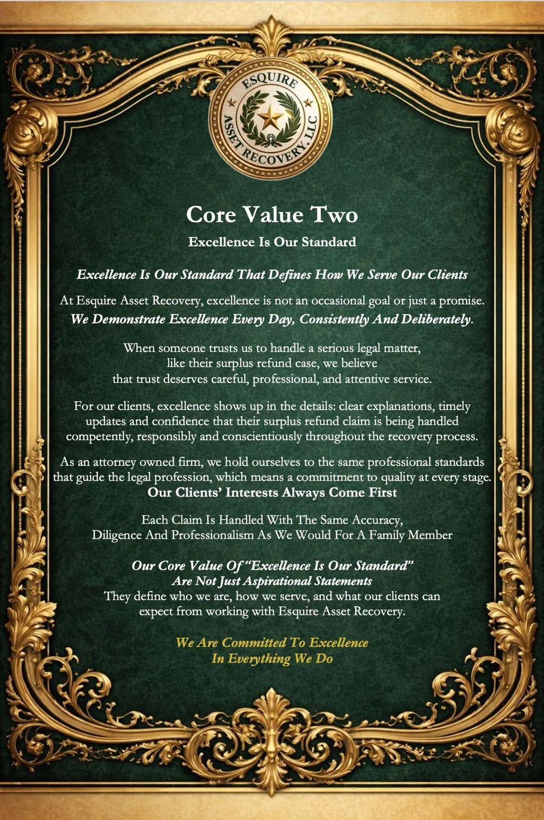 Honesty and integrity are non negotiable at Esquire Asset Recovery. They are the foundation of everything we do. We believe trust is built through clear communication, truthful representation, and consistent ethical behavior. Our clients deserve accurate information, realistic expectations, and transparency throughout the recovery process.